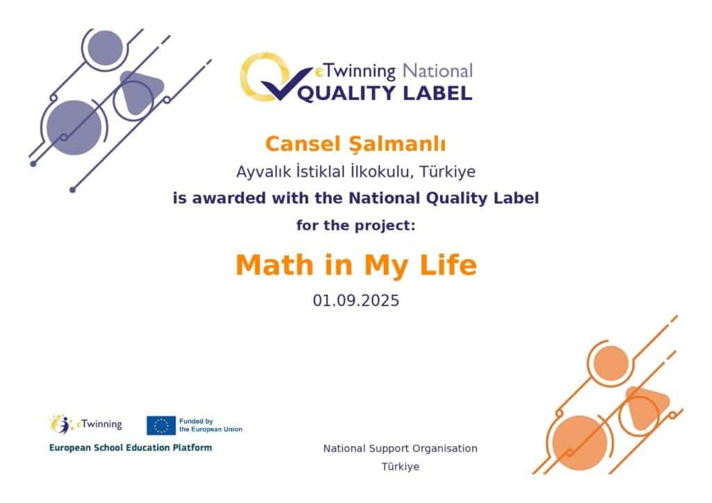 2024-2025 Eğitim Öğretim yılında 3-A sınıfı öğrencilerimiz öğretmenleri Cansel Şalmanlı rehberliğinde yürütmüş oldukları "MATH IN MY LIFE" adlı e Twinning projesi ulusal kalite etiketi almıştır.